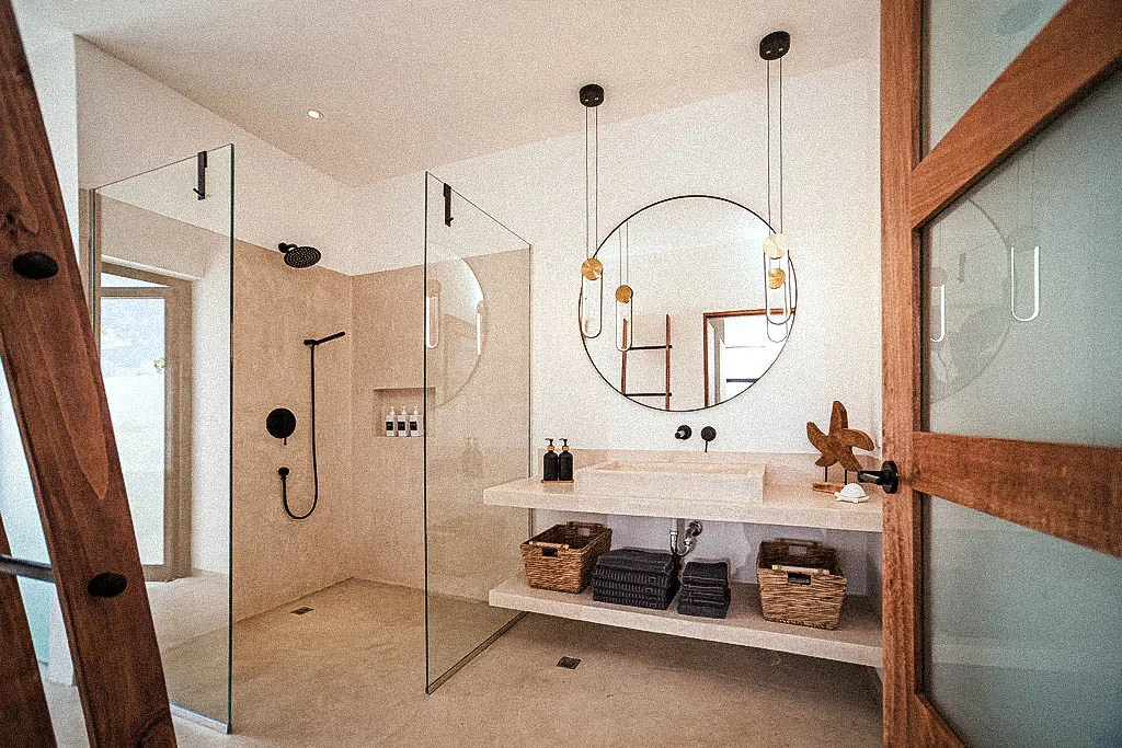 The exterior is an invitation to slow down: a private swimming pool, jacuzzi, and secluded outdoor soaking tub create a serene, spa-like atmosphere surrounded by lush greenery.